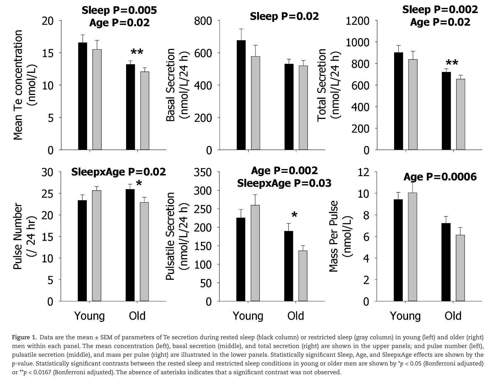 A more recent 2019 study by Smith and colleagues [2] looked at both 5 nights of less than 4 hours of total time in bed and 6 weeks of delaying sleep by 1.5 hours and neither of these sleep restriction conditions resulted in significant changes in serum testosterone in healthy men age roughly 20-45.